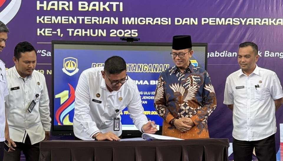 Serah terima hibah tersebut ditandai dengan penandatanganan Berita Acara Serah Terima (BAST) antara Bupati OKU H. Teddy Meilwansyah dan Kepala Kanwil Ditjen Imigrasi Sumsel Guntur Sahat Hamonangan dalam rangkaian peringatan Hari Bakti Kementerian Imigrasi dan Pemasyarakatan ke-1 di Aula Kanwil Ditjen Imigrasi Sumsel, Rabu (19/11/25).