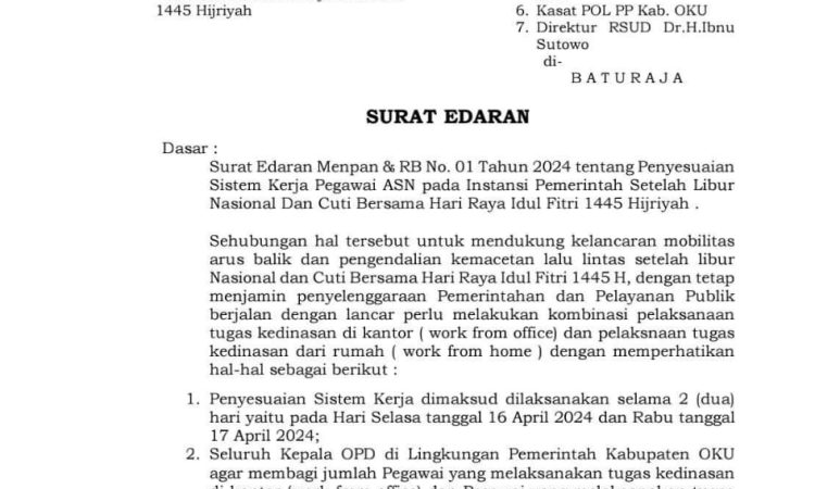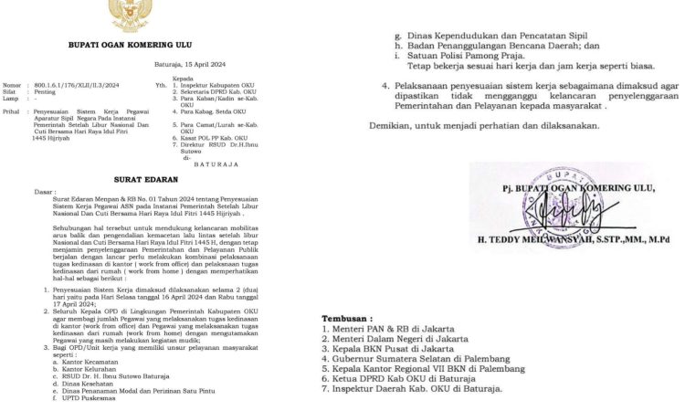 Ogannews.com – Pemerintah Kabupaten Ogan Komering Ulu (Pemkab OKU) mengumumkan Work From Home (WFH) untuk pegawai Aparatur Sipil Negara (ASN) usai libur nasional dan cuti bersama hari raya Idul Fitri 1445 Hijriah.